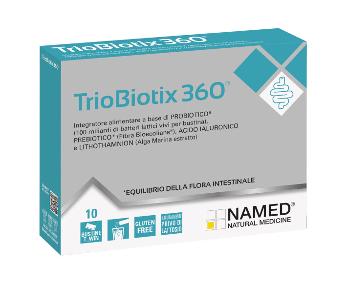 Integratore alimentare a base di PROBIOTICO (100 miliardi di batteri lattici vivi), PREBIOTICO (Fibra Bioecolians), Acido ialuronico e Lithothamnion (Alga Marina estratto mineralizzato).